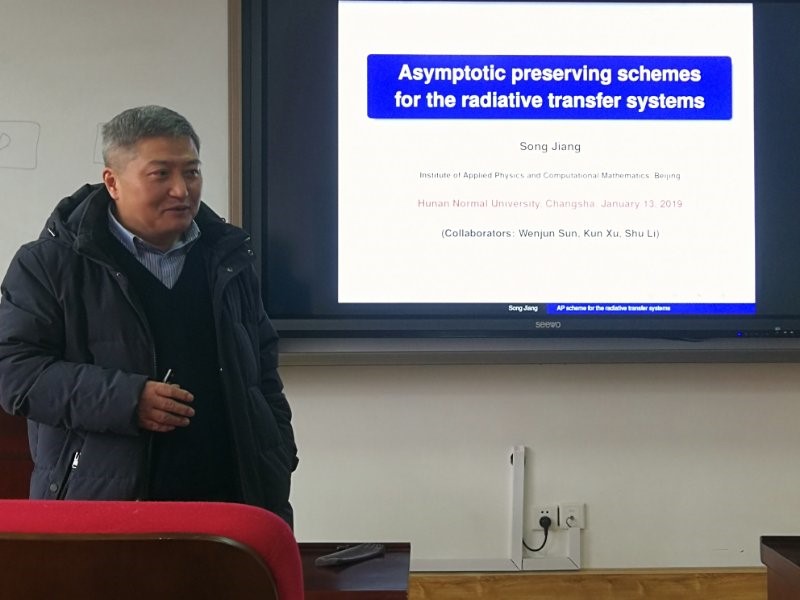 (通讯员 袁永军 龚艳红)2019年1月13日下午,应数学与统计学院邀请,中国科学院院士、北京应用物理与计算数学研究所研究员、应用数学与计算数学专家江松莅临数统院,并为学院师生带来题为“Asymptotic preserving schemes for the radiative transfer systems”的精彩学术报告。报告在数统院307报告室进行,由数统院院长谢资清主持。