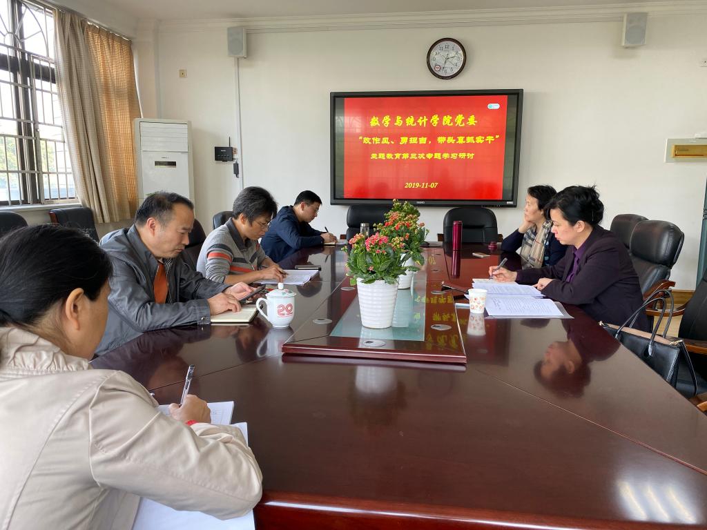 11月7日下午,数学与统计学院党委理论中心组在理学楼301会议室召开“不忘初心、牢记使命”主题教育第三次集中学习研讨会,大家围绕“改作风、勇担当、带头真抓实干”主题研讨交流。会议由院党委书记颜中玉主持,监察处副处长、督导组成员周伊慧到会指导。