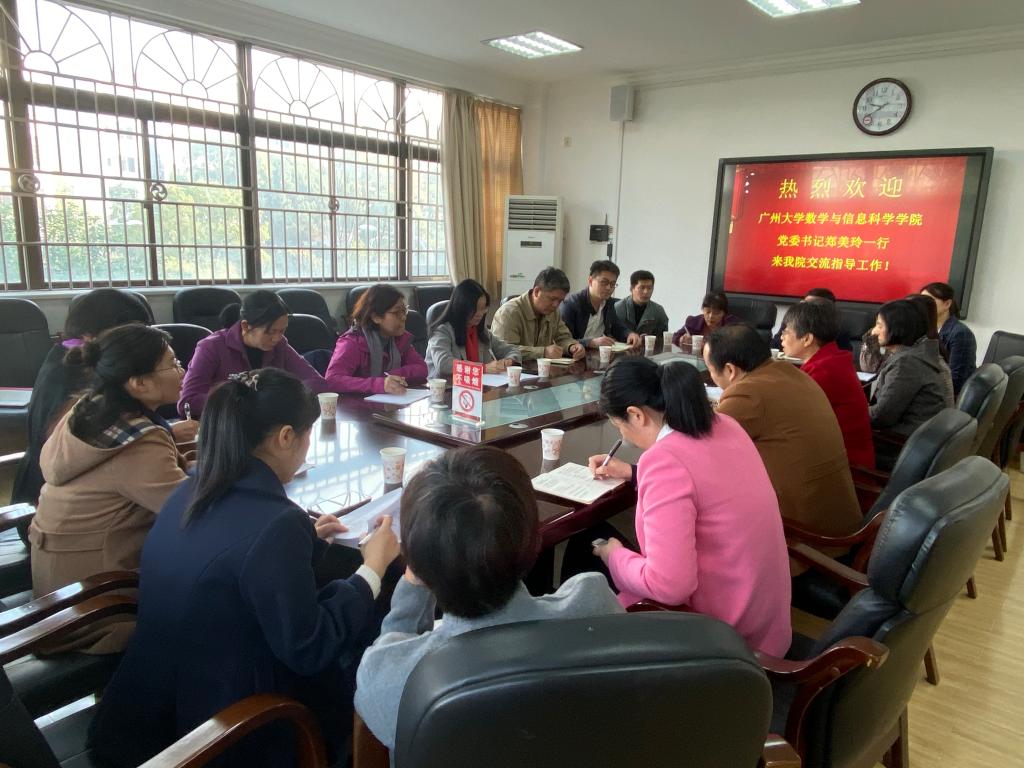 12月13日,广州大学数学与信息科学学院党委书记郑美玲一行来我校数学与统计学院(以下简称“数统院”)调研行政管理工作。数统院党委书记颜中玉、副院长高其举、副书记熊卓然等在学院301会议室热情接待了客人并开展交流研讨会。会议由数统院党委书记颜中玉主持。