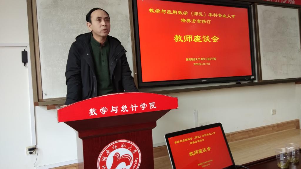 为进一步加强专业建设,推动学院数学与应用数学专业认证工作,1月18日下午和1月19日上午,学院在理学院301会议室举行了“数学与应用数学师范专业人才培养方案制(修)订论证会”,特邀数学学科专业认证成功的华中师范大学数学与统计学院副院长郑高峰教授作专题报告。学院在校的领导班子成员、参与专业认证工作的全体教师、校评建办副主任袁俏、音乐学院副院长资利萍、国防科大数学教授李建平、两位中学数学老师优秀代表彭熹和王小武,以及两位学生代表参加了此次会议。会议由教学副院长黄元秋教授主持。