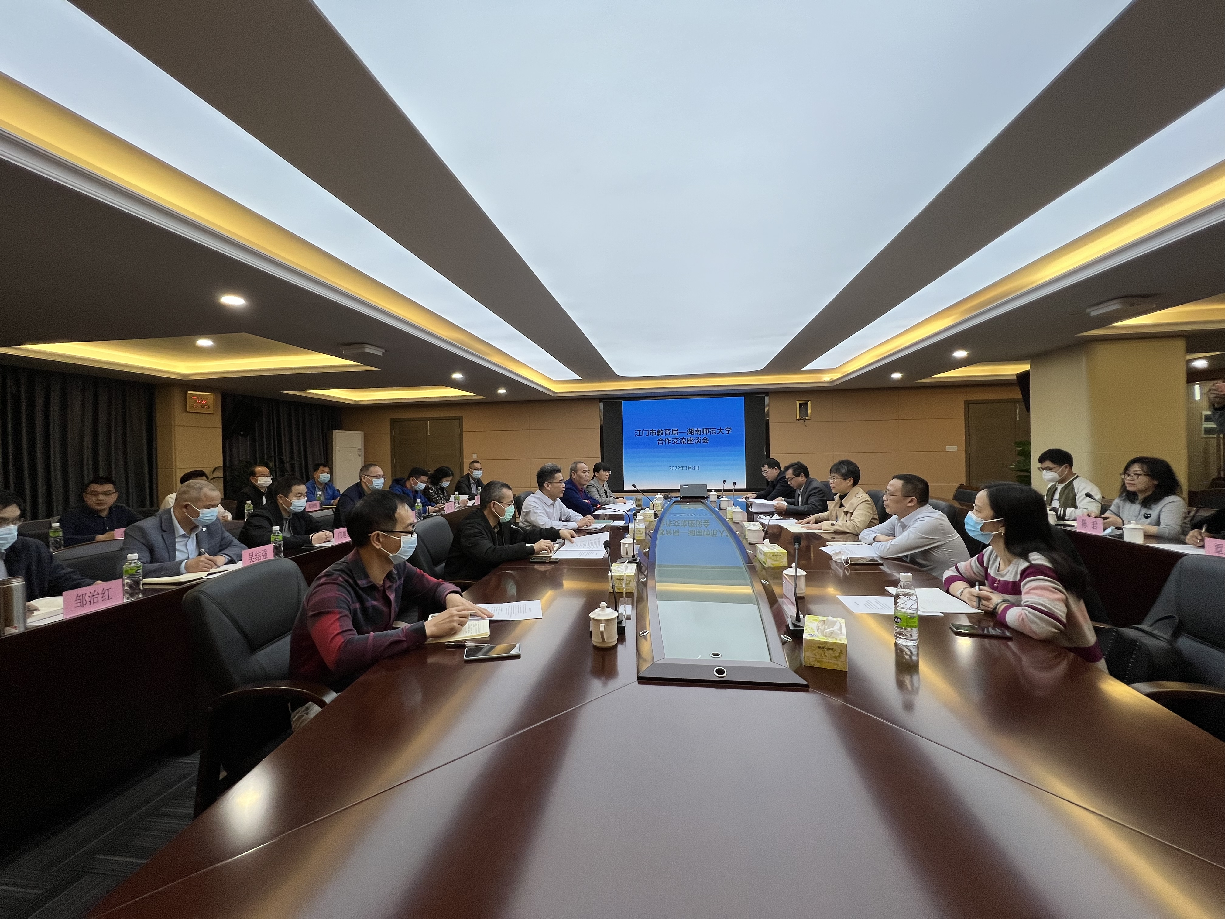 座谈会上,双方就人才培养、毕业生见习和教师招聘等方面展开了广泛的交流,并达成了初步的合作意向。大家纷纷表示,湖南师范大学数学与统计学院和江门市教育局有着良好的合作基础,今后要进一步整合优势资源,加强合作交流,让合作项目尽快落地,为江门市基础教育事业发展贡献力量。