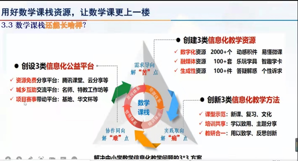 唐剑岚介绍了“数学课栈”的基本情况及其助力乡村数学教育的实践。他展示了“数学课栈”长什么样、有什么资源、做什么用。他以神奇的自然常数e、圆的面积公式和路径最短问题等直观、动感、有趣的积件为例,提出如何应用“数学课栈”资源,促进乡村数学教育减负、提质、增效。