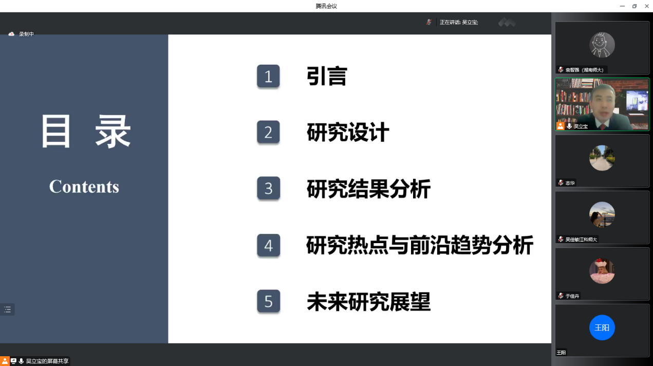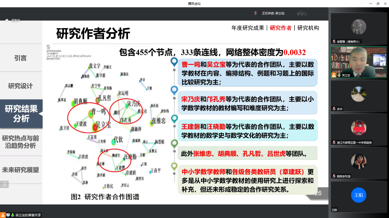 2022年10月22日星期六晚上7:30-9:30,天津师范大学吴立宝教授做客湖南师范大学“麓山数学教育论坛”,通过腾讯会议平台进行了一场主题为“新世纪以来我国中小学数学教材研究热点、演进与展望”的讲座。此次讲座由数学系副主任袁智强主持。