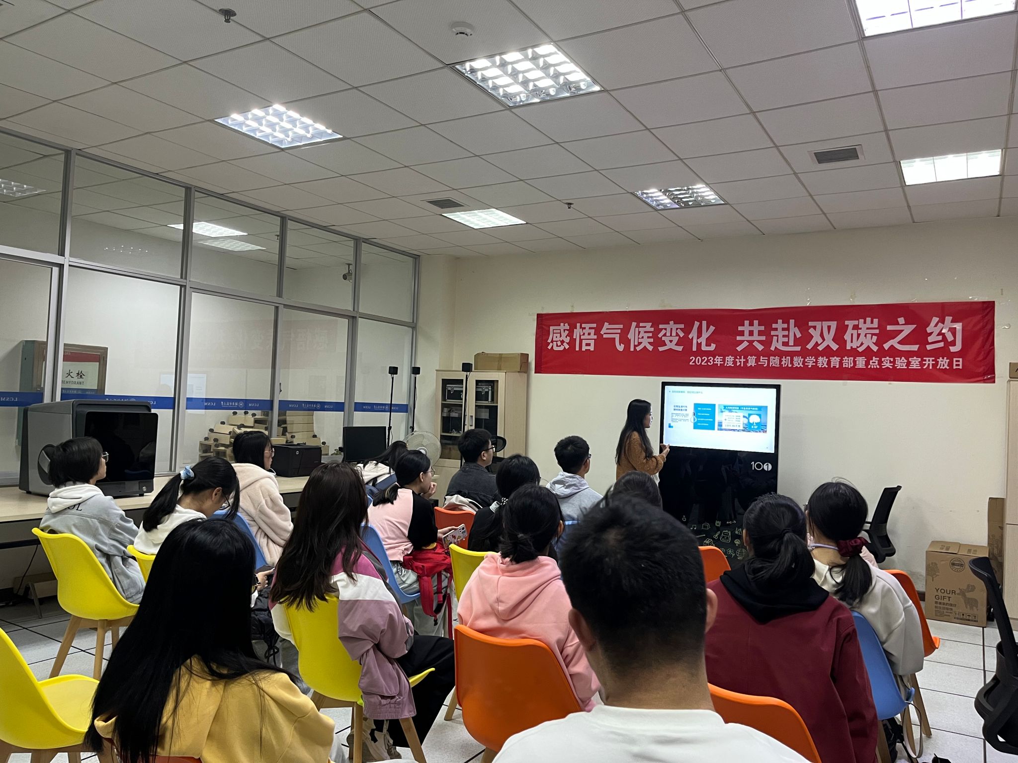 为了提高同学们的科学素养、普及最新科研成果和科技发展动态,11月23日下午计算与随机数学教育部重点实验室在里仁楼二楼开展了主题为“感悟气候变化,共赴双碳之约”的科普开放日活动。数学与统计学院30名本科生参加此次活动。