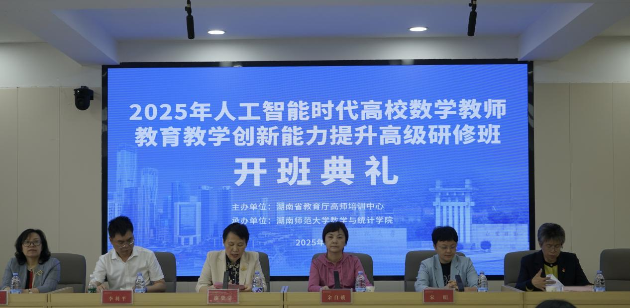 2025年4月24日,由湖南省高等学校师资培训中心主办、湖南师范大学数学与统计学院承办的“2025年人工智能时代高校数学教师教育教学创新能力提升高级研修班”在湖南师范大学数学与统计学院隆重开班,湖南师范大学副校长谢资清、湖南省高师培训中心副主任余自娥、湖南省高师培训中心办公室主任宋明、数学与统计学院院长李利平、院党委书记颜中玉、副院长陈君出席了开班典礼。典礼由数学与统计学院副处级组织员覃志斌主持。