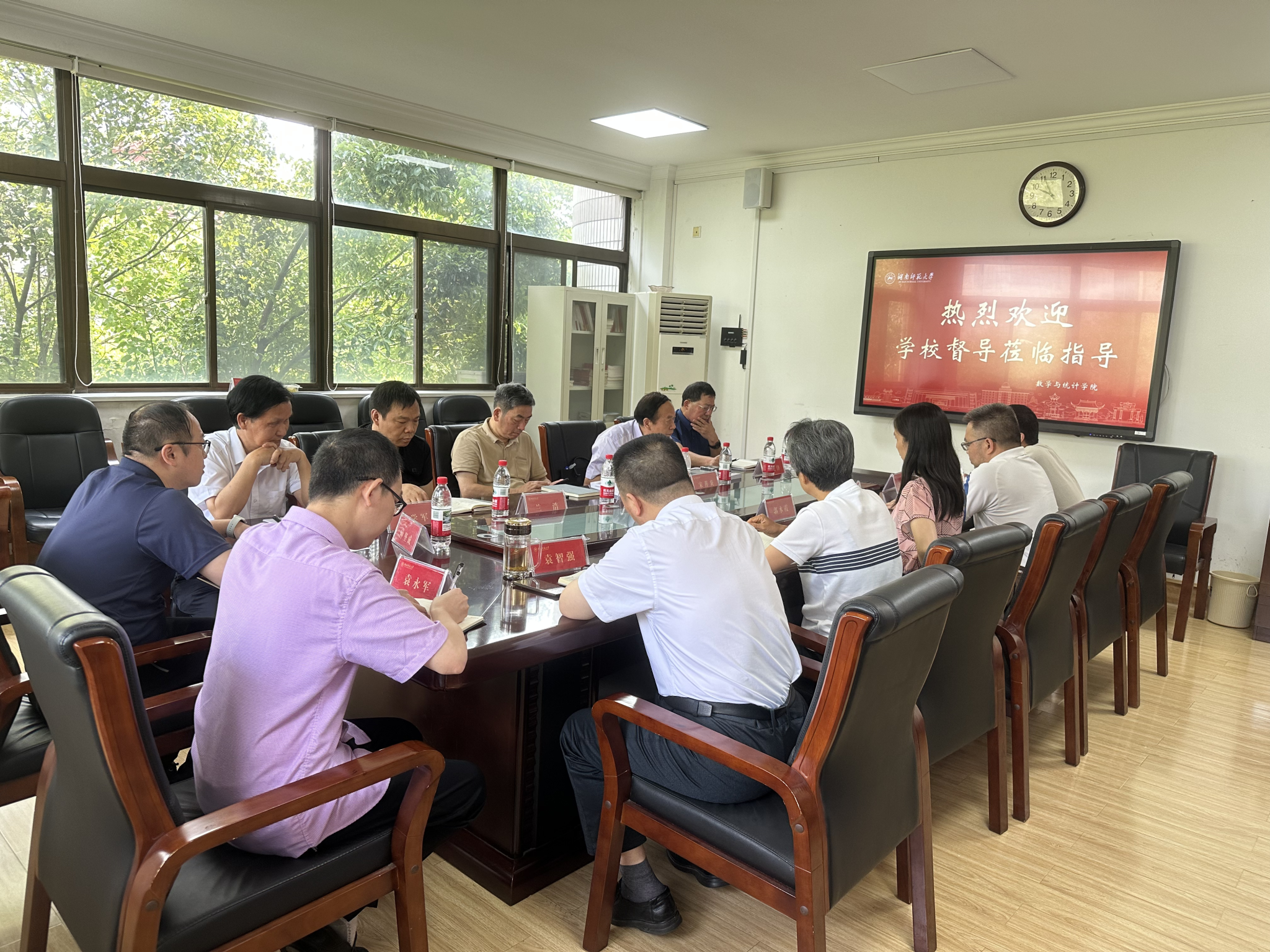 2025年5月21日上午,湖南师范大学第八届教学督导委员会赴数学与统计学院开展本科教育教学常规督查工作,围绕人才培养体系优化、教学管理规范及硬件设施建设等核心环节展开深度调研。本次督导组由校教学督导委员会主任、原副校长黎大志和副主任委员兼第三组组长宋善炎带队,组员包括刘先锋、兰浩、张学军和钟坚成等四位委员。数学与统计学院党委书记颜中玉、副院长郭水霞、数学专业负责人袁智强、统计系主任周杰明、统计系副主任杨晶、信息系副主任袁永军、教务办主任余雅睿、学工办主任李俐、相关教师代表和工作人员参加了本次督查工作。