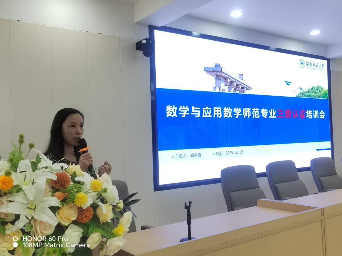 会议最后,教学副院长郭水霞针对数学与应用数学专业三级认证工作进行了全面讲解,详细阐述了三级认证的基本情况、进校考查的重点以及具体落实措施。