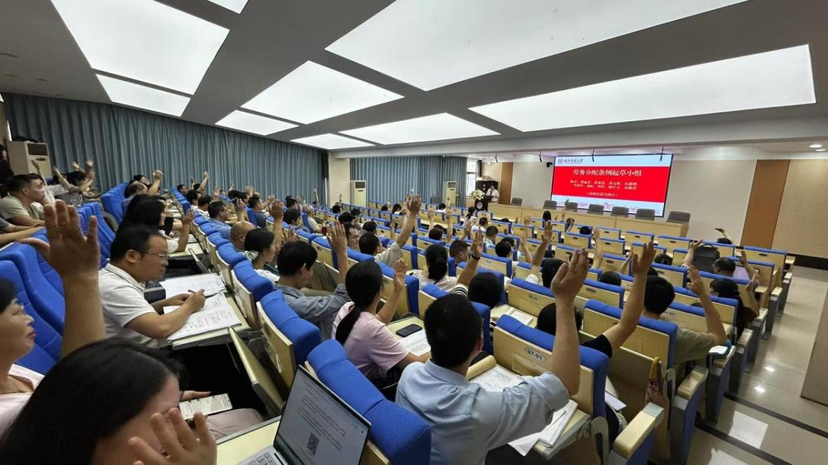 随后,学院工会主席龚也君提交了学院劳务分配条例起草小组名单,供全院教职工大会审议,经全员举手表决,一致通过了该名单。
