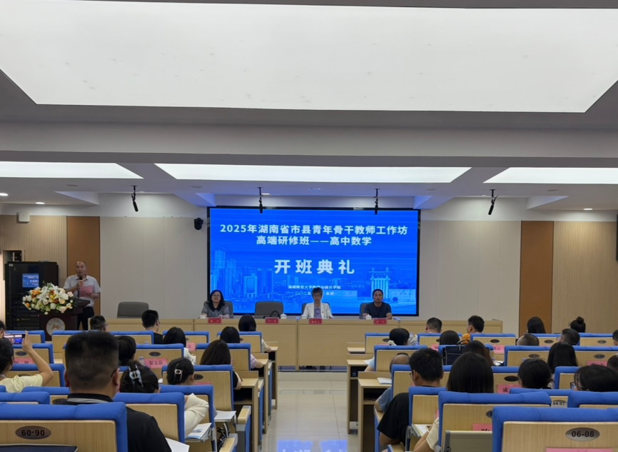 10月12日上午,2025年“省培计划”—市县青年骨干教师工作坊高端研修项目(高中数学S110-3、S110-4)开班仪式在湖南师范大学数学与统计学院309报告厅举行。数学与统计学院党委书记颜中玉、副院长陈君、衡东县杨山实验学校党总支书记董仁思、本期培训班班主任、数学与统计学院培训中心主任吴千、副主任李嘉欣,以及来自湖南省各县市的80名高中数学骨干教师参加了仪式。仪式由数学与统计学院行政副院长陈君主持。
