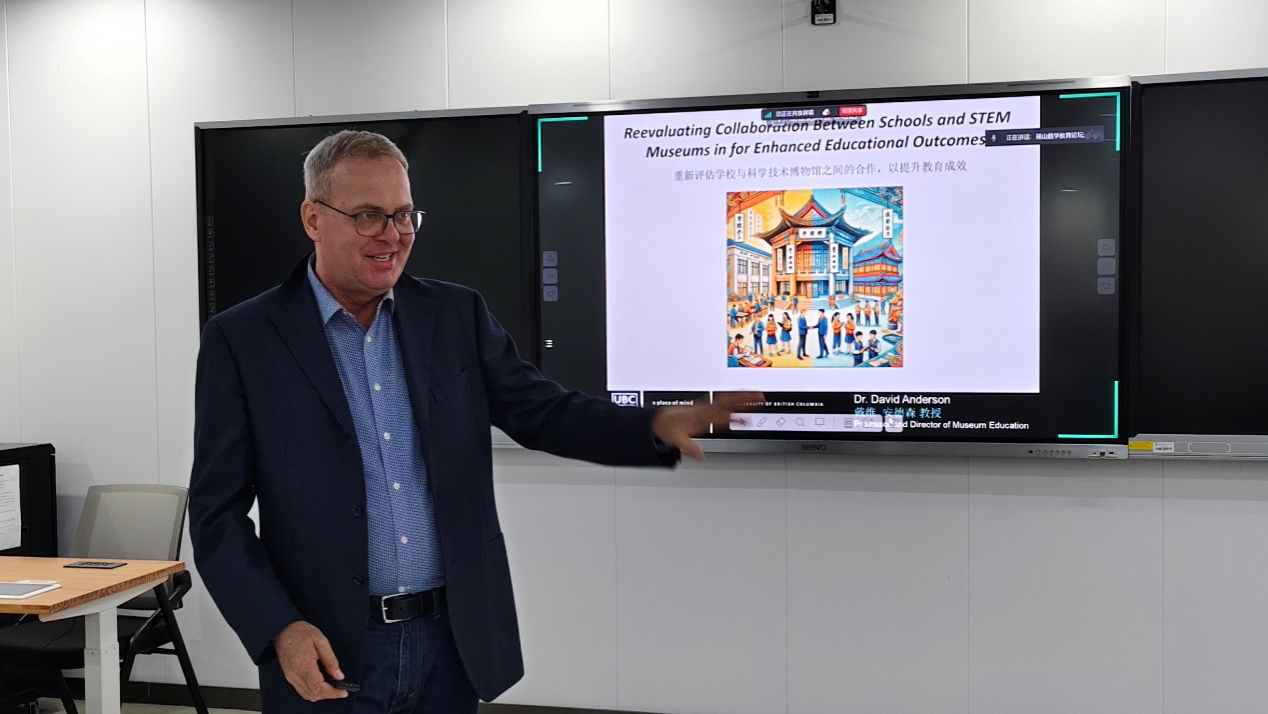 2025年11月2日星期日晚上,加拿大英属哥伦比亚大学大卫∙安德森(David Anderson)教授做客湖南师范大学“麓山数学教育论坛”,在格物楼402智慧教室进行了一场主题为“审视馆校合作路径,共谋STEM教育成效”的讲座。此次讲座由数学系副主任袁智强教授主持,中南大学马克思主义学院季娇副教授担任现场口译。