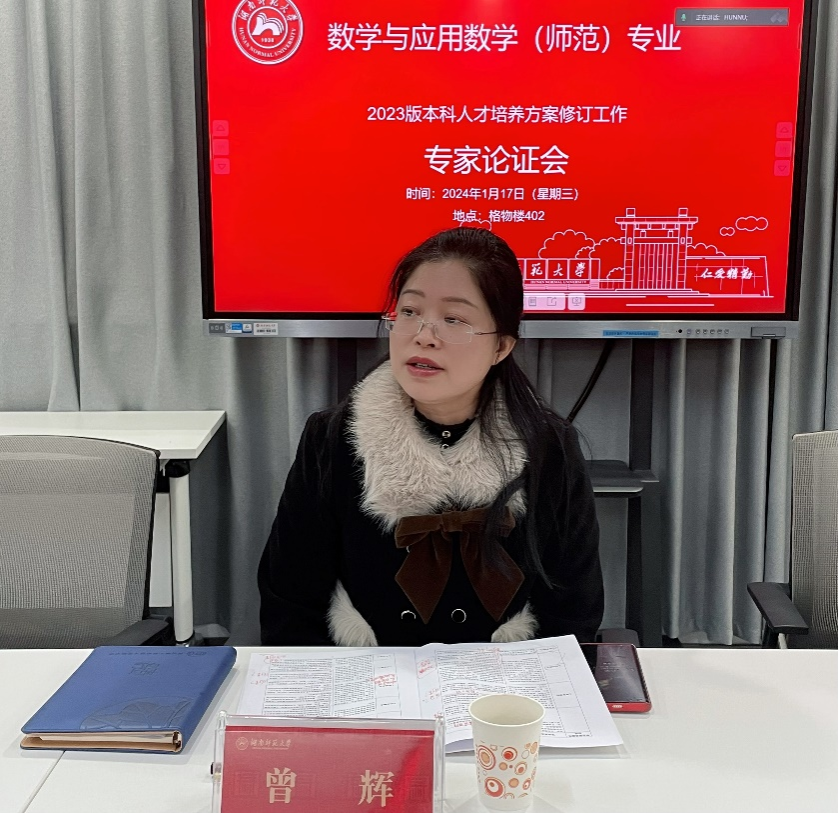 参加论证会的人员包括:湖南师范大学教学副校长谢资清教授;专家组组长、陕西师范大学罗新兵教授以及专家组成员、湖南师范大学黎大志教授,宋善炎教授、谭长银教授、刘白教授和学校评建办袁俏副主任;利益相关方代表包括:中学数学正高级教师、湖南湘江新区教师发展中心主任向利平(1991届本科毕业生);中学数学正高级教师、湖南省“双名计划”初中数学名师、湖南师大附中博才实验中学教学副校长曾辉(2002届本科毕业生);国际数学奥林匹克(IMO)金牌教练、长沙市雅礼中学数学教研组长彭熹(2004届本科毕业生);湖南省“双名计划”高中数学名师、衡东县第一中学教学副校长董仁思;湖南师范大学数学与应用数学专业2020级本科生覃卫民和曾皓楠;湖南师范大学数学与统计学院院长李利平、党委书记颜中玉、教学副院长郭水霞、数学系主任赖柏顺、数学系副主任袁智强、孙少辉、教务办主任余雅睿等20人。此外,湖南师范大学附属中学副校长李智敏,长郡中学原教务主任、现长沙市雷锋学校校长王毅以及长沙市第一中学数学教研组长兼数学竞赛总教练于杰延提供了书面意见。会议由数学与应用数学专业负责人袁智强教授主持。
