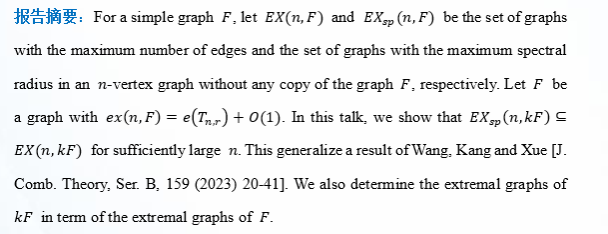 报告人简介:康丽英,上海大学数学系教授,博士生导师。1999年于中国科学院数学与系统科学研究院获得博士学位。研究兴趣包括极值图论、图和超图的谱。曾获“上海市三八红旗手”,“上海市曙光学者”称号。担任中国运筹学会常务理事、中国工业与应用数学学会组合图论专业委员会秘书长、中国数学会组合图论分会理事。在《Journal of Combinatorial Theory, Series B》、《SIAM Discrete Mathematics》、《Journal of Graph Theory》、《European Journal of Combinatorics》等学术期刊上发表学术论文170余篇。主持国家自然科学基金项目多项,参加国家自然科学基金重点项目1项,重大研究计划1项。