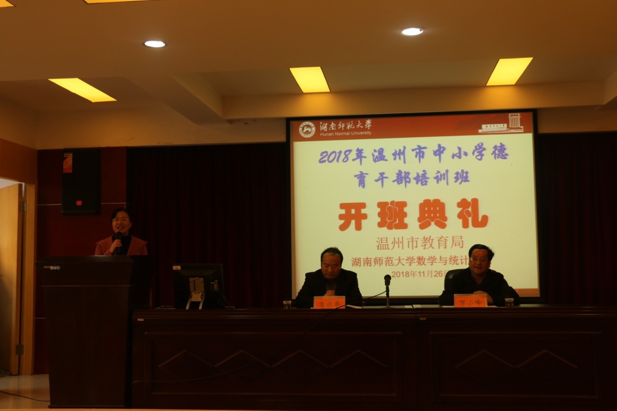 11月26日上午,2018年温州市中小学德育干部培训班开班典礼在数统院309报告厅顺利举行。温州市教育局基教处处长万小峰,湖南师范大学数学与统计学院副院长高旗举出席了典礼,典礼由数统院成教办主任尹冬平主持。