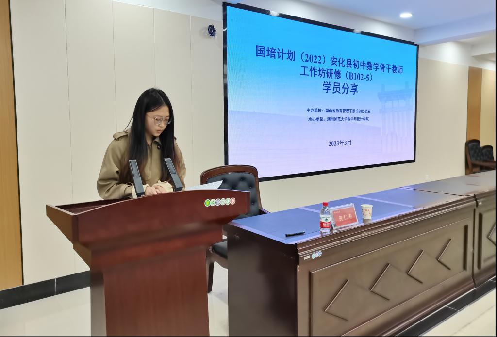安化县紫薇中学教师闵成辉作学员代表发言,她对安化县教师发展中心和湖南师范大学数学与统计学院提供的学习机会表示感谢,并表示将在此次培训中认真学习、努力提高,相互交流,共同进步。
