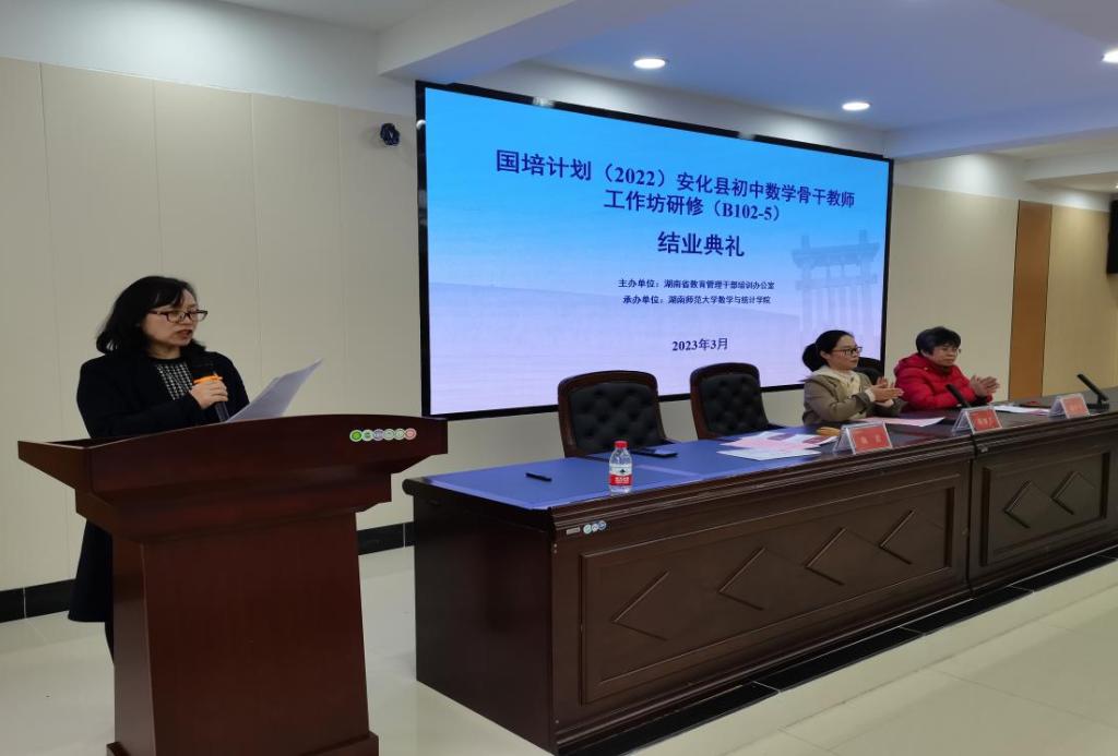 培训活动结束后,在309教室举办了结业典礼。湖南师范大学数学与统计学院党委书记颜中玉、安化县教师发展中心教研员蔡翠芳出席典礼。典礼由湖南师范大学数学与统计学院副院长陈君主持。