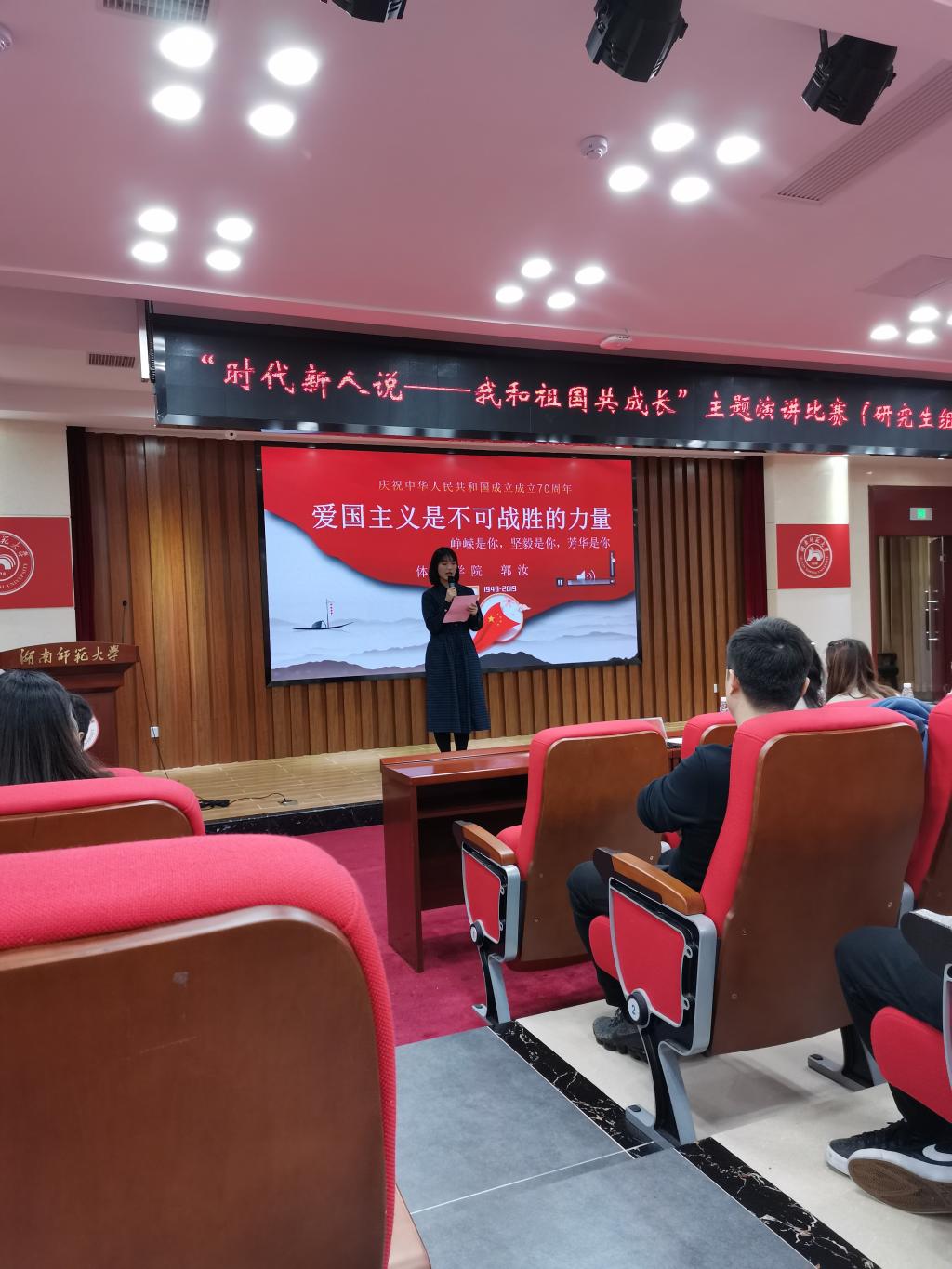 (通讯员 丁港 李娟)10月26日下午,我校“时代新人说”研究生组比赛在中和楼129进行。此次比赛由不同学院的25位选手参加,同学们紧紧围绕主题进行了精彩的演讲。同学们以《祖国在成,吾辈在长》、《我,阿中哥的铁粉》、《一颗行星的告白》、《天山脚下的成长之路》、《浴火重生、颂我中华》等为演讲题目,各具特色。在比赛现场他们用十分的准备加十分的用心为我们呈现的不仅是他们的能力还有对祖国饱满深沉的爱。忆往昔峥嵘岁月,砥砺奋进七十载,看今朝太平盛世,同心逐梦新时代。师大人用自己独特的语言向七十华诞的祖国母亲献礼。